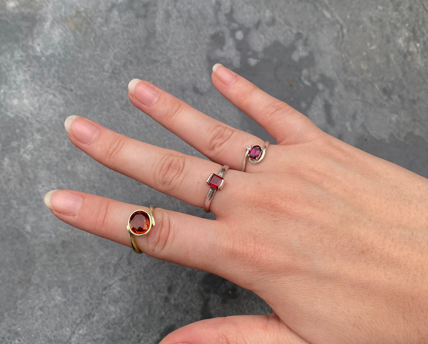Inspired by wisdom and intuition, the Amber ring is made in 14K solid gold with a bypass setting to provide depth, inlaid with a Hessonite Garnet gemstone as the focal point. Whether you wear it alone or stack it with more delicate shades, this piece is sure to impress.