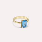 A major upgrade to your ring collection. This ring is a 14K Solid Gold reverse tapered style finished with a rectangular blue Topaz gemstone in a basket setting. Wear this fabulous piece with colorful gemstone rings to enhance the beauty of your personality.