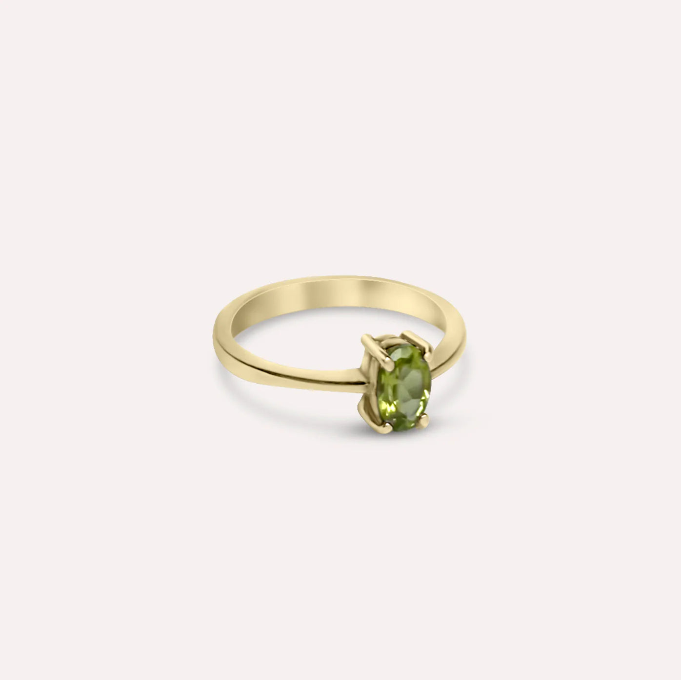 Classic style made of 14K Solid Gold inlaid with a fine Peridot gemstone in a basket set. Designed to inspire positive thoughts and remind the wearer of their worth of self-love. Can be worn solo or paired with colorful gemstone rings.