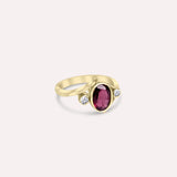 Melissa ring creates dimension using an asymmetric bypass set, features White Topaz on both sides and a Garnet gemstone in the center. Inspired by blooming flowers, this piece is an expression of self-love and gratitude for its wearer.