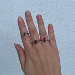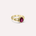 A fine addition to your ring collection. Garnet gemstone in a drop shape features a one-side split setting making this a unique 14K solid gold design. This bezel setting enhances the gem's beauty, invoking the love and kindness we all have. Wear it solo or stack it with light-colored gemstone jewels.