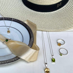 A simple design with a bright yellow citrine gemstone. This gemstone is said to aid in self-improvement for the wearer. The Harper design blends harmonious opposites: light and shade. Make it a statement by wearing it alone or layer it with bold gemstone jewels.
